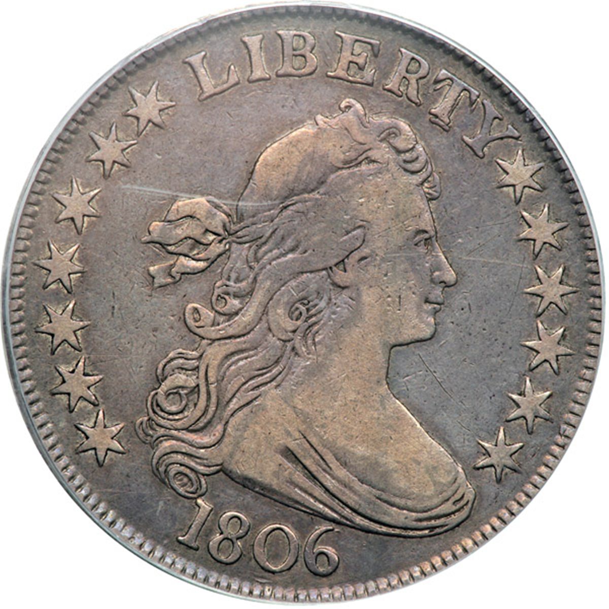 1806 Draped Bust Half Dollar. Pointed 6, stem through claw. . O-114a, Rarity-4. PCGS graded VF-25. Evenly struck with uniform antique grayish-violet toning. LIBERTY double cut on TY. Later die state with massive die break spanning the reverse. A die variety collector's dream coin! In this instance there is a heavy die crack from the milling opposite the second feather of the left wing crossing the entire reverse and through E in AMERICA to the edge. Another crack from first at left wing tip through D in UNITED into field (PCGS # 6071) .