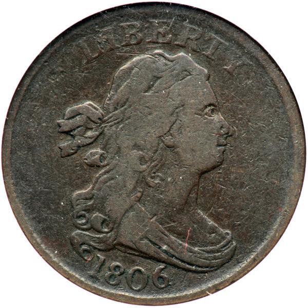 1806 C-1 R1 Stemless Wreath. ANACS graded Fine-12. Double Struck Obverse, Reverse Brockage Maker. Rather glossy dark olive brown and chocolate with slightly lighter steel brown toning on the highpoints. No corrosion or verdigris, just light contact marks consistent with the grade. These include a few faint hairline scratches on the cheek and bust plus a stronger one under IB into the hair below E. Double struck. The obverse was struck twice by the obverse die but rotated 15 degrees between the impressions leaving clear doubling on the neck, bust, and along the back of the head. The reverse was struck by the die first, then against a new blank planchet during the second strike creating a reverse brockage on the new planchet. The characteristic swelling associated with being a brockage maker is clearly evident on the reverse, especially at UNIT into the wreath below. Our grade is VG10. The "Obv Dbl Struck" feature is noted on the ANACS label. Davy #06.1.22.
