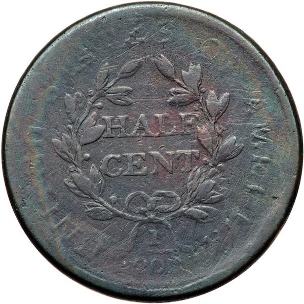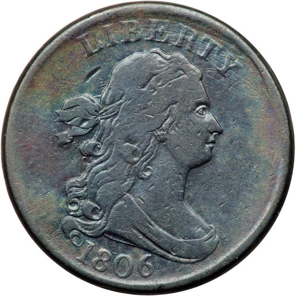1806 C-1 R1 Stemless Wreath G5. Double Struck Reverse. Sharpness VG10, especially on the obverse, but cleaned and retoned glossy dark bluish steel and olive brown. There are fine pinscratches on both sides, strongest at ERTY, plus an obvious nick in the field behind the head. The reverse was double struck with clear doubling visible on the wreath and HALF CENT. The offset is largest at the bottom of the wreath thanks to a minor rotation, and the denominator, although quite faint, reads 2200 rather than 200. The obverse shows no doubling at all, very similar to the preceding lot, and that side may have been struck against a new blank planchet creating an incuse brockage impression. However, there is no swelling on the obverse to help support that position. Davy #06.1.6.