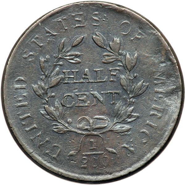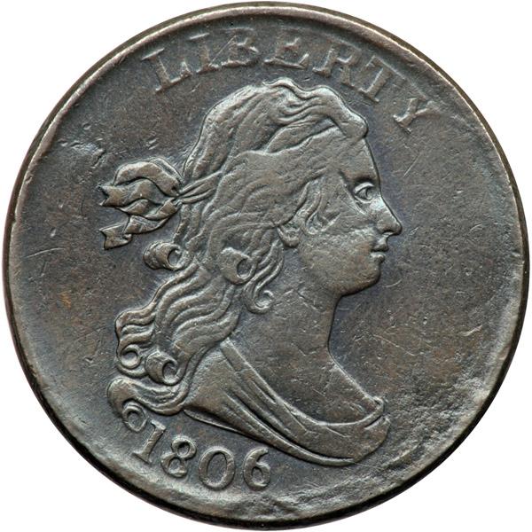 1806 C-1 R1 Stemless Wreath VF25. Triple Struck Reverse, Obverse Brockage Maker, Incomplete Planchet. Sharpness VF35 but the coin was lightly cleaned and retoned an attractive glossy chocolate brown with overtones of light bluish steel. There are a few light contact marks on both sides but most of the surface distractions are the result of an incomplete planchet. The planchet is thin and wavy near the rim on the right side of the obverse and on the opposing areas on the reverse with the deepest void at AME. It appears this planchet was cut a bit too close to the end of a planchet strip where the thickness was not up to standard. In addition, the reverse shows clear evidence of having been struck at least three times, especially on the left half of the wreath and most of HALF CENT. There is no trace of more than one strike on the obverse, but that side does show some minor swelling that suggests it was struck against a new blank planchet creating an obverse brockage. The stemless wreath feature is obvious. Weight 81.4 grains, a bit lighter than the 84.0 grain standard, which you would expect for an incomplete planchet. Davy #06.1.21.
