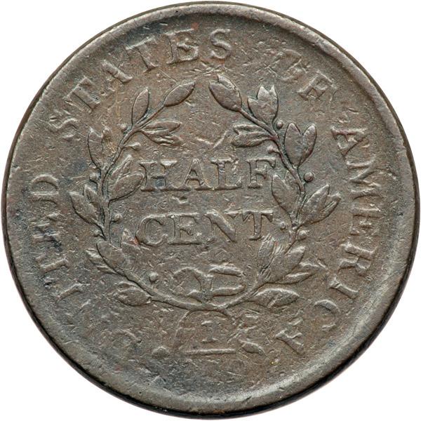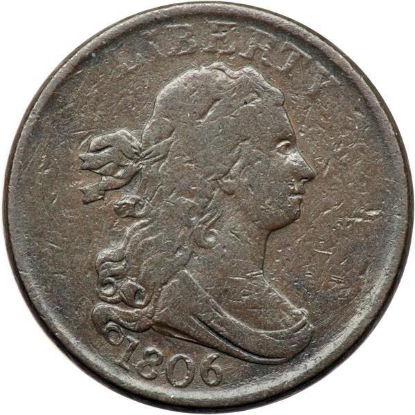 1806 C-1 R1 Stemless Wreath VG8. Double Struck Reverse. A couple points sharper but there are far too many light contact marks for the sharpness grade, especially on the obverse. No corrosion or verdigris. Mostly glossy chocolate and steel brown. The reverse was double struck but the offset between strikes is very small, less than a half millimeter. The doubling is clear on the wreath and HALF CENT, but the small offset makes it difficult to differentiate between a "chatter strike" or "double strike." And there is no hint of doubling on the obverse and no swelling that would suggest that side may have been a brockage maker. Davy #06.1.23.