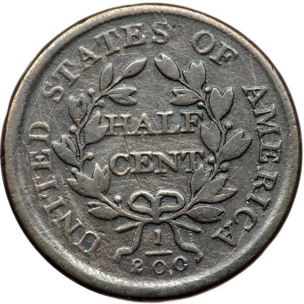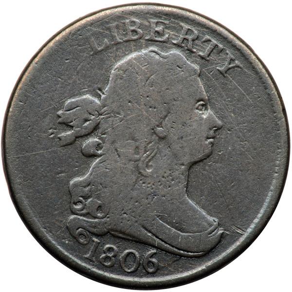 1806 C-2 R4 Small 6 with Stems G5. Very slightly sharper but there are many faint hairline scratches in the fields, mostly on the reverse. The only marks visible without a glass are a group of very light, dull pinpricks on the neck, a couple nicks off the bust tip, and a dull scratch down through CE in CENT. No corrosion or verdigris. Glossy dark chocolate and olive. The date and legends are complete and clear. LDS, Manley state 3.0, with a strong die crack from the 6 to the bust tip. This piece is listed in the Manley book as an example of the late die state (Cohen:231). Davy #06.2.6.