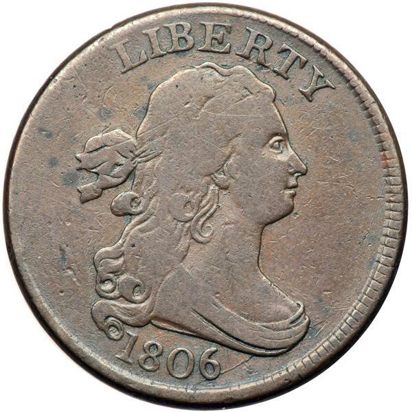 1806 C-2 R4 VG8. Very slightly sharper with a few too many light contact marks for the higher grade, including a couple fine scratches inside the top of the wreath. Otherwise the color and surfaces are very attractive for the grade. Glossy light chocolate brown with a few tiny puffs of darker olive and steel toning in the field behind the portrait. Struck with the obverse die clearly misaligned to K-10 while the reverse is centered on the planchet. Very late die state, later than the latest reported by Manley (his 3.0). In addition to a strong die crack from the 6 through the bust tip there is a fine die crack passing along the tops of RIC in AMERICA. The crack at RIC was thought to occur during the later 1806 C-3 die marriage, but this piece confirms the crack occurs during the C-2 marriage. It also invalidates Manley state 1.0 for 1806 C-3, which supposedly has an uncracked reverse. Another very important piece for the die state specialist.