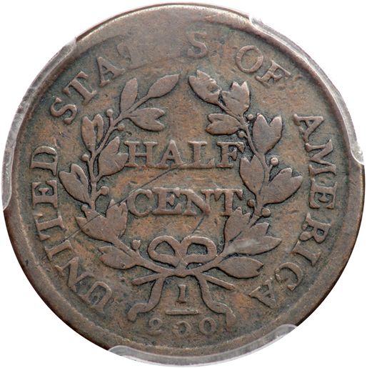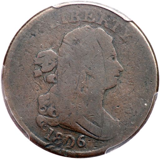 1806 C-3 R6 Small 6 with Stems. PCGS graded Good-4. Glossy medium chocolate and steel with slightly darker olive and steel toning in protected areas. The surfaces are smooth, free of any trace of corrosion or verdigris. The only marks are a collection of nicks under the 8 in the date and a few fine hairline scratches on both sides, the strongest of these from the I in UNITED to ALF in HALF. The nicks under the 8 were strong enough to create a slight bulge at the rim above TE in STATES, and this bulge resulted in excessive wear on those two letters. Otherwise the date and legends are complete and strong. EDS, Manley state 1.0, prior to the die crack at ICA in AMERICA. Our grade is net G4+, close to G5. A decent example of this very rare variety. The attribution is noted on the PCGS label.