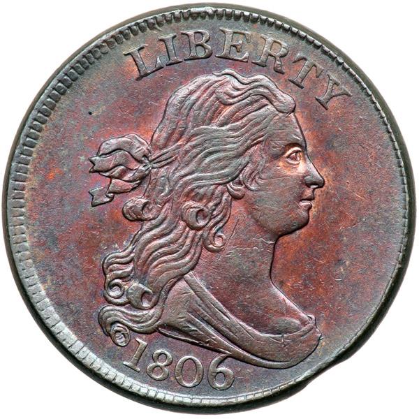 1806 C-4 R1 Large 6 AU55. Mint state sharpness but lightly cleaned and retoned frosty olive and dark bluish steel with very faded red showing through in protected areas. No spots, stains, or notable signs of contact. The best identifying mark is a tiny planchet clip affecting the dentils at the bust tip and over the second S in STATES. E-MDS, Manley state 1.0. The repunching on the 6 is sharp and the reverse is rotated 25 degrees CW. The strike is slightly weak on the bust tip and at the top of the wreath, as usual for this variety due to the improper die rotation.