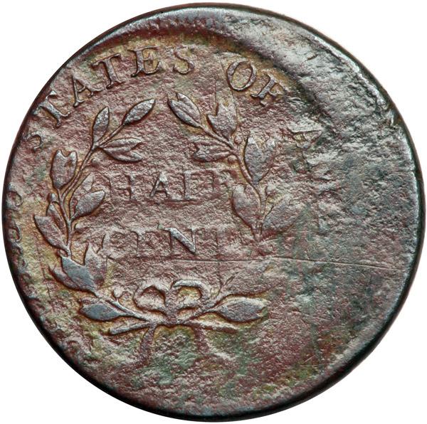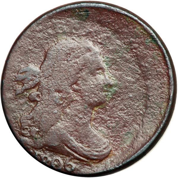 1806 C-4 R1 Large 6 with Stems AG3. Off Center. Sharpness VG10 but covered with moderate roughness under a glossy reddish chocolate patina. There are traces of waxy greenish verdigris in the protected areas but no notable marks. Struck 20% off center to K-8.5. The bottom of the 18 is off the planchet but the 06 part is strong. Not an especially attractive piece, but this type of error is very rare for the variety. Davy #06.4.12.