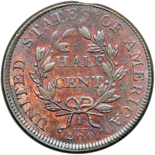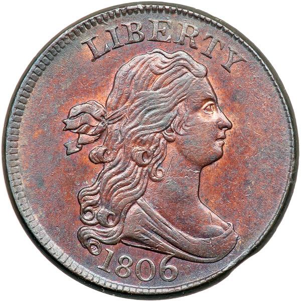 1806 C-4 R1 Large 6 with Stems AU50. Repunched 6. Sharpness very close to mint state but lightly cleaned and retoned lustrous bluish steel brown and chocolate with underlying very faded red in the fields and protected areas. No spots or stains, only trivial ticks of no significance. A tiny planchet clip weakens the dentils off the bust tip and ES in STATES. E-MDS, Manley state 1.0. The repunching on the 6 is clear and the reverse is rotated 30 degrees CW. The bust tip and opposing area at the top of the wreath are softly impressed, as often seen on this variety.