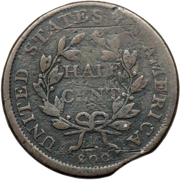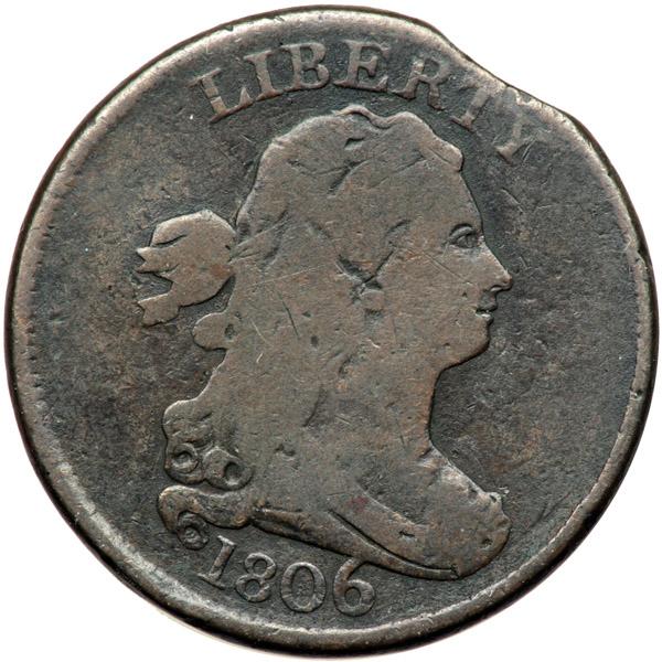 1806 C-4 R1 Large 6 with Stems G5. Clipped Planchet. Very slightly sharper but there is an old horizontal scratch under TES in STATES, a couple more through the fraction, and traces of minor roughness inside the wreath. No verdigris. Mostly glossy chocolate and steel brown, the devices a couple shades lighter than the protected areas. A curved planchet clip touches the top of the T in LIBERTY and affects the dentils right of the fraction. The dentils across from the clip are weak on the obverse, the so-called Blakesly effect that comes with most mint clips. Struck with the reverse rotated about 10-15 degrees CW relative to a normal head-to-foot die orientation. The date is strong and the legends are complete except for weakness at OF. Davy #06.4.13.