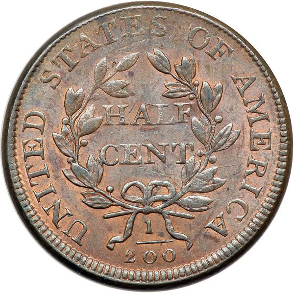 1806 C-4 R1 Large 6 with Stems MS60. Repunched 6. Lustrous bluish steel brown and light olive with mellowed mint red covering 15% of the planchet, mostly on the obverse. The fields are satiny and offer excellent cartwheel luster. Would deserve a higher grade if not for some tiny, very light contact marks scattered over both sides. The best identifying marks are a speck of very shallow carbon under the leaf below TE in STATES and a tiny scratch that connects the tops of the A & L in HALF. E-MDS, Manley state 1.0. The repunching on the 6 is clear and the reverse is rotated 40 degrees CW. The bust tip is softly struck as nearly always seen on this variety due to the rotated dies. Weight 83.5 grains.