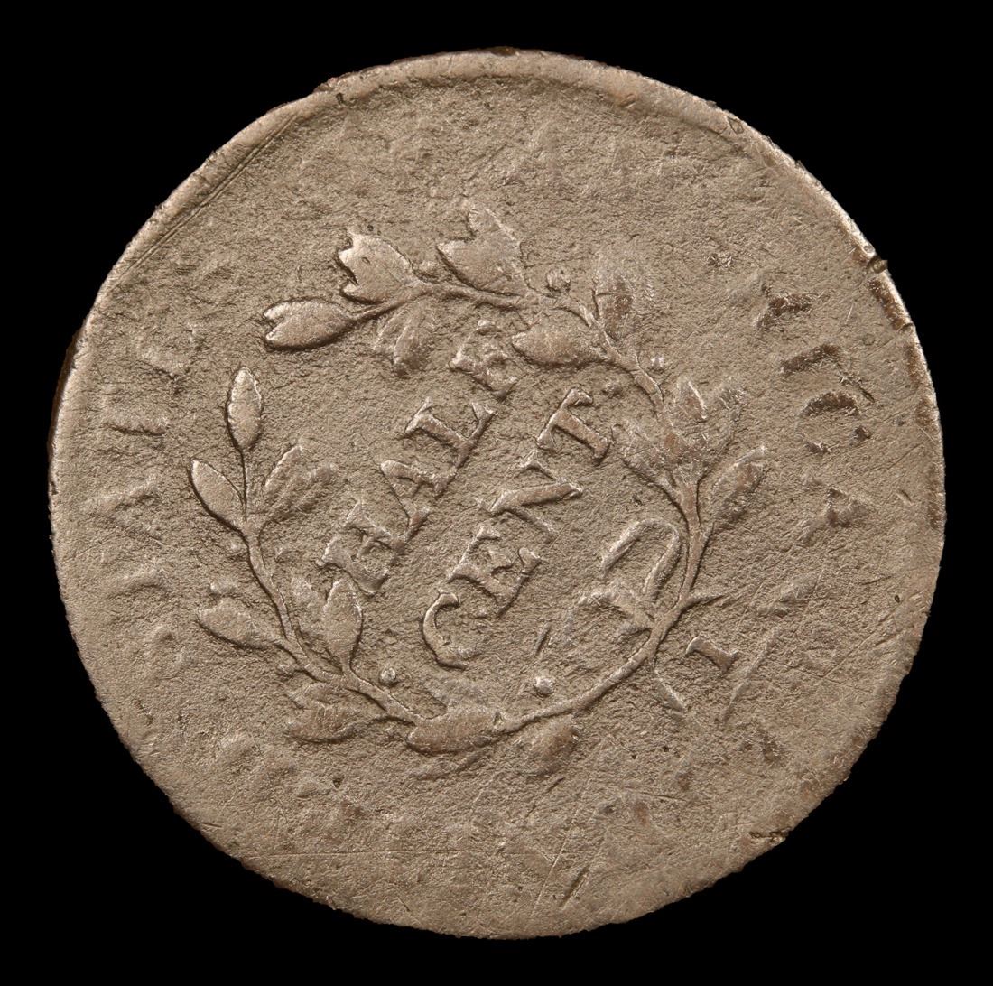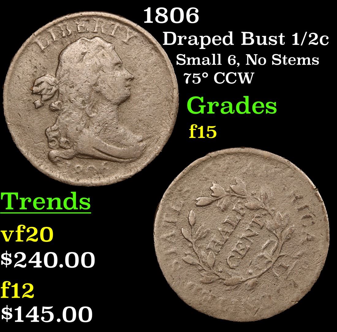 1806 Small 6, No Stems 75° CCW Draped Bust Half Cent 1/2c Grades f+.