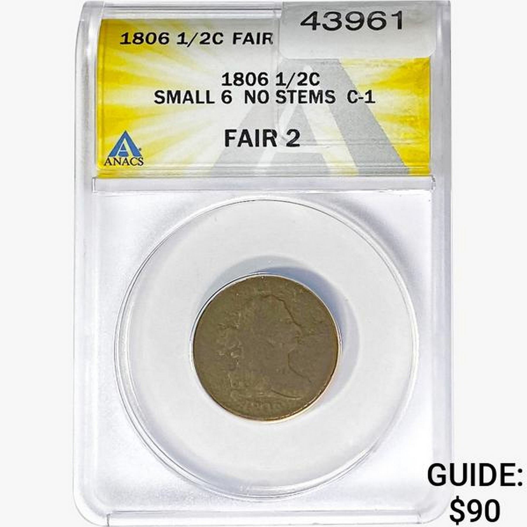 1806 Draped Bust Half Cent ANACS F2 Sm. 6 No Stems