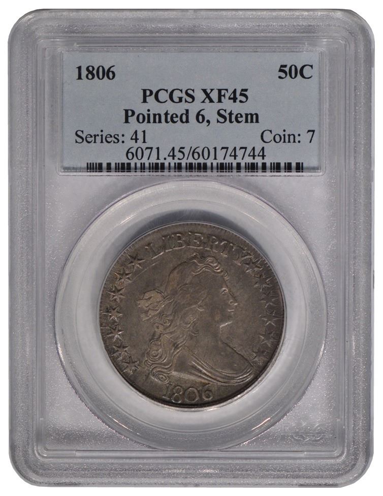 One 1806 Draped Bust Liberty Half Dollar PCGS XF45 Pointed 6 Stem.