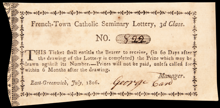 This original FRENCH-TOWN CATHOLIC SEMINARY LOTTERY ticket was printed in East Greenwich, Rhode Island in July of 1806. This 3rd Class ticket is numbered 822 and is signed by George Card, Manager. Ticket measures approx. 5” x 2.25” with all of the border designs well upon the paper. This ticket is boldly printed in deep black and very clean overall. This is an exceedingly rare early American Lottery ticket.