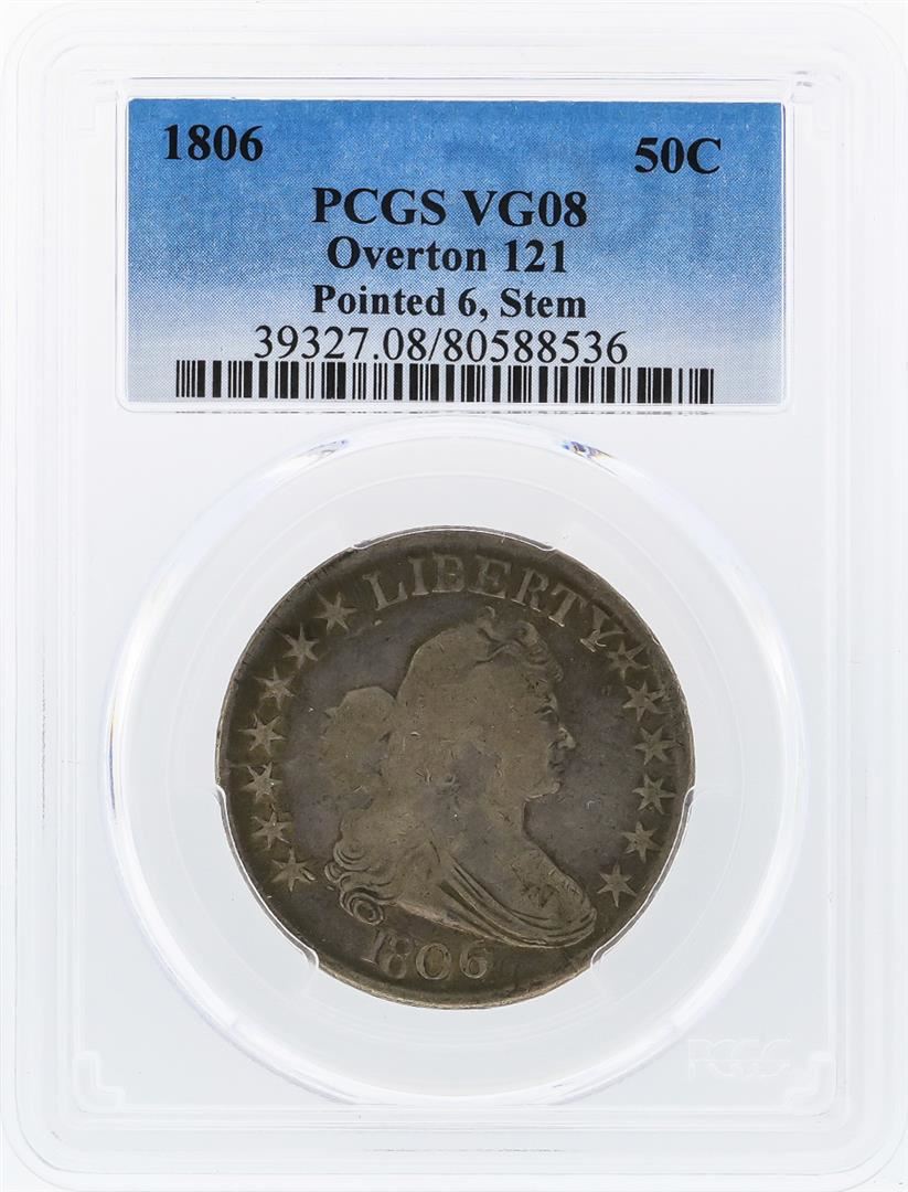 One 1806 Heraldic Eagle Half Dollar Coin PCGS VG08 Pointed 6. PCGS Graded.