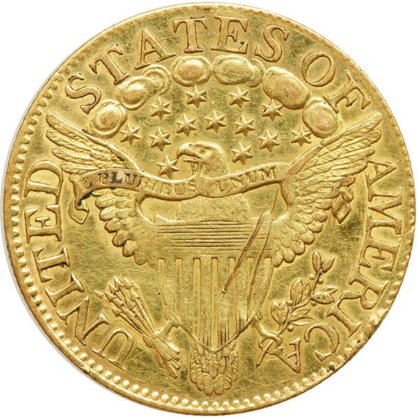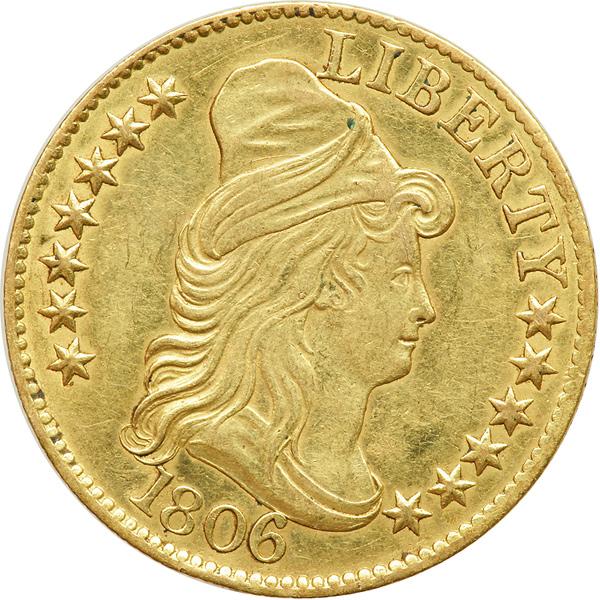 1806 Knobbed 6 BD-6, Rarity 2. Sharpness of EF. Reverse scratches. Cleaned years ago. A still-generaous amount of luster present within the devices of the highest desirablity for this popularly collected Capped Bust, Large Eagle Type. Light golden color blends smoothly with spot-free highlights on the surfaces.