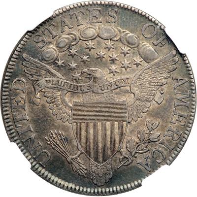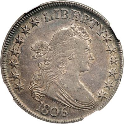 1806 $1 Draped Bust. NGC graded AU-55. Choice and attractive, a coin well placed for inclusion in a U.S. Type Set. Easily recognizable variety: Pointed 6, stem, Y recut at left side, die cracks; defect lines at upper corners of shield. This somewhat elusive Rarity-3 variety is most easily identified by the die crack above the hair of Liberty on the obverse, and on the reverse by the broken patch on the shield. The list of finest examples sold at public auction (compiled by Stephen Herrman) includes pieces graded 65, 63, 63, 55, 55, 45. Pop 1; 5 finer for the variety, 2 in 58, 1 in 62, 1 in 63, 1 in 64.