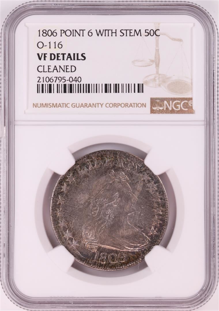 One 1806 Point 6 with Stem Draped Bust Half Dollar Coin NGC VF Details O-116. NGC Certified.