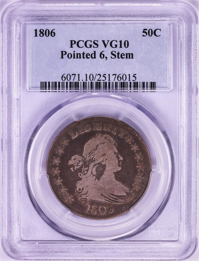 One 1806 Pointed 6 Stem Draped Bust Half Dollar Coin PCGS VG10. PCGS Graded.
