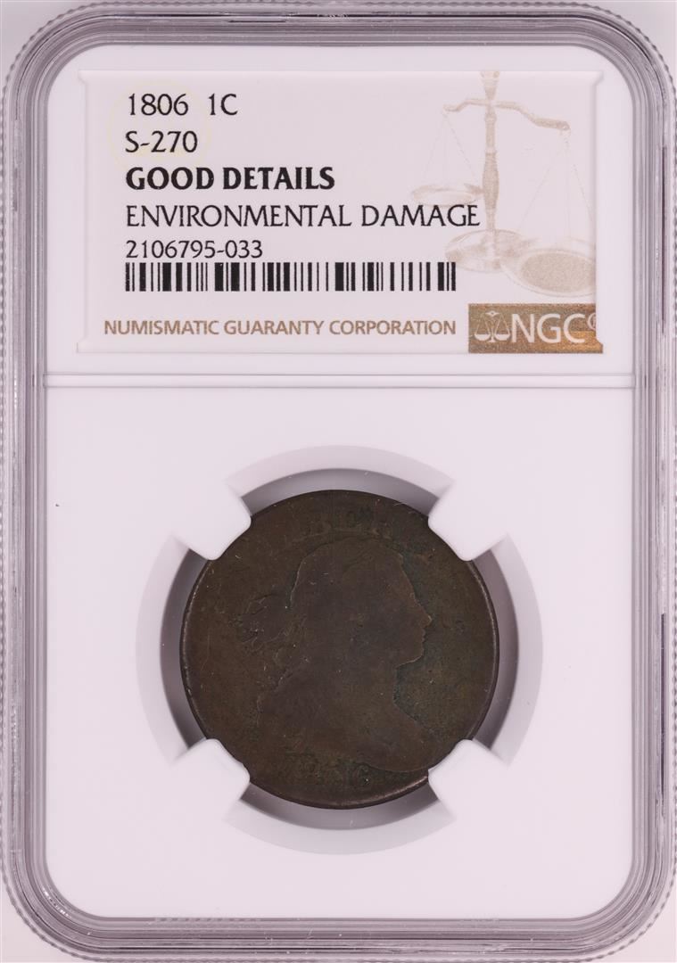 One 1806 S-270 Draped Bust Large Cent Coin NGC Good Details. NGC Certified.