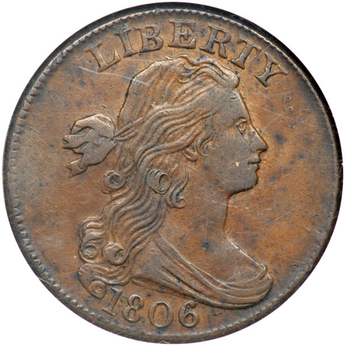 1806 S-270 R1 NGC graded AU50. Frosty medium chocolate brown with steel brown toning on the highpoints and lighter brown and golden tan toning showing in protected areas, especially on the reverse. There is a sprinkle of small spots of slightly darker toning on the obverse, including one in the field off the tip of the nose. The surfaces are smooth, void of any trace of corrosion or verdigris. The only notable marks are a few dozen microscopic pinpricks scattered over the reverse, none notable, and a couple faint hairline scratches under ONE. E-MDS, Breen state II. Our grade is VF35.