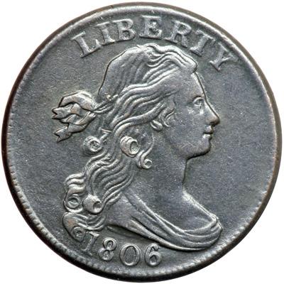 1806 S-270 R1 PCGS graded "Genuine". Sharp details but there is extremely faint roughness well hidden under a glossy dark olive and steel patina. Flowline luster covers the fields and protected areas, and this cent offers excellent eye appeal in spite of the relatively dark toning. No verdigris or marks. LDS, Breen state IV, with a narrow but clear rim cud break over AT in STATES. Our grade is EF40 sharpness net VF30.