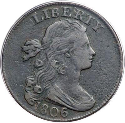 1806 S-270 R1 PCGS graded "Genuine". Sharpness VF30 but covered with uniform fine roughness. No marks or verdigris. Slightly glossy dark olive and steel. The date and legends are strong. Our grade is net F12.