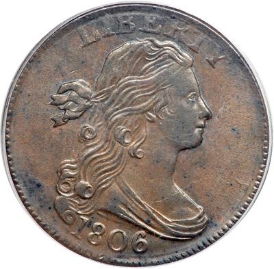 1806 S-270 R1. PCGS graded MS-63 Brown. Breen Plate Coin. Frosty medium brown with steel brown toning on the highpoints and a couple small splashes of darker olive toning at the lower curls. The surfaces are frosty and attractive, but there is a faint, disjointed diagonal hairline scratch from the drapery above the 0 in the date across the bust into the field before the neck. LDS, Breen die state IV. There are multiple sets of die clashmarks on both sides and delicate bulges in the field left of the lowest curl and at the 06 in the date. Called MS61 and tied for CC#2 honors in the Bland census. Noyes says MS60 net AU55 and tied for CC#6, his photo #31598. Our grade is MS60. This is the Breen plate coin for the variety. PCGS Population 1; Finest graded at PCGS for the variety. DWH #2831.