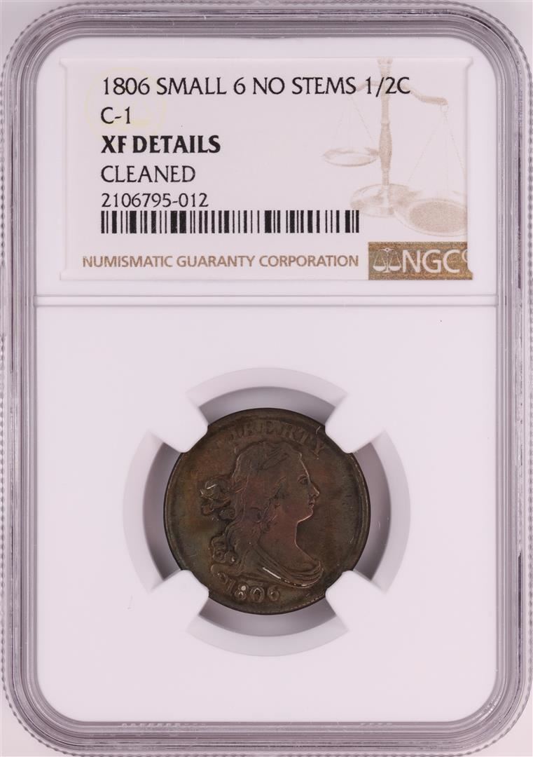 One 1806 Small 6 No Stems C-1 Draped Bust Half Cent Coin NGC XF Details. NGC Certified.
