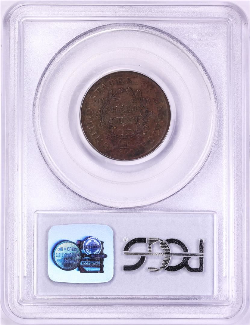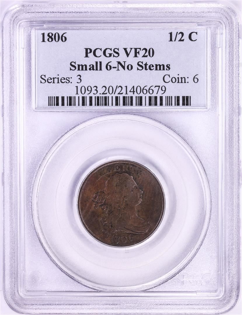 One 1806 Small 6 No Stems Draped Bust Half Cent Coin PCGS VF20. PCGS Graded.