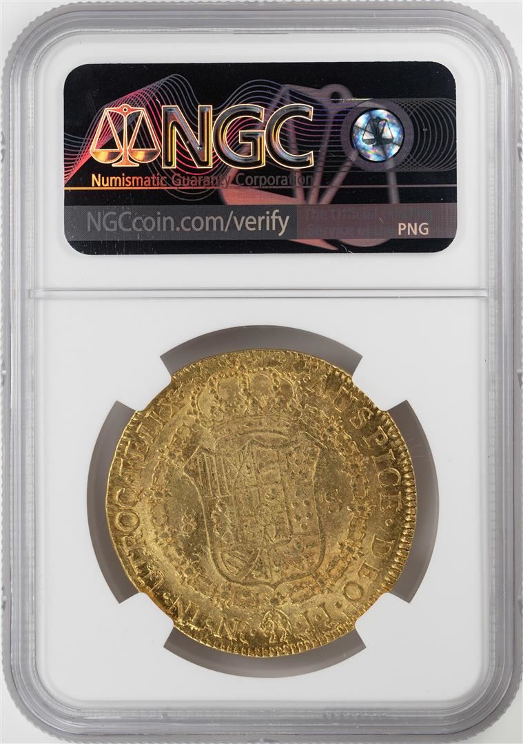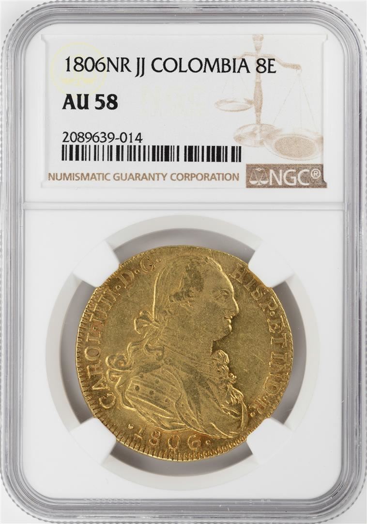 One 1806NR JJ Colombia 8 Escudos Gold Coin NGC AU58. NGC Certified.