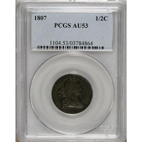 <B>1807 1/2 C AU53 PCGS.</B></I> C-1, B-1, R.1, the only dies. Luster shimmers from the designs of this deep brown half cent. The E in CENT and the first S in STATES are slightly granular, and Liberty's chin has a slender mark, but the surfaces are otherwise refreshingly smooth. EAC 40.<BR><BR><b>Shipping:</b> Coins & Currency (<a target="_blank" href="http://www.heritageauctions.com/common/shipping.php">view shipping information</a>)