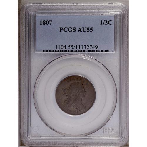1807 1/2 C AU55 PCGS. C-1, B-1, R.1. A chocolate-brown 1807[1/2 C] AU55 PCGS.