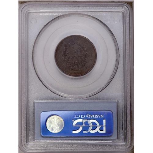 <B>1807<1/2 C> AU55 PCGS.</B></I> C-1, B-1, R.1. A chocolate-brown Draped Bust half cent with moderate wear on Liberty's hair, cheek, and shoulder. The wreath and HALF CENT are sharp, while STATES OF is faded from long-in-use dies. EAC 30. Population: 18 in 55, 31 finer (4/06).