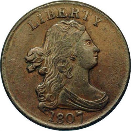 <B>1807<1/2 C> C-1, B-1, R.1. Die State 3--Improperly Cleaned, NCS--AU Details. AU50 EAC.</B></I> Tall, double punched 7; Five berries left, with stems. The date has the digit 7 double-punched, as always for this single variety of the year, although evidence of the repunching is quite weak in this late die state. Due to the relative size of the individual digits of the date, Walter Breen suggested that the digit 7 was from the same punch as the 1807/6 Large 7 Cent, Sheldon-273. This is almost certainly not the case, however, for the digit on the latter coin would have overlapped both the border and the drapery on this smaller diameter planchet. Lovely chestnut-brown surfaces with considerable olive color on the obverse. Light verdigris adheres to the surfaces around the devices, and appears to be completely removable with careful conservation.<BR><I>Ex: Jim McGuigan; J.J. Teaparty (12/24/1985).</B></I> Envelope Included.