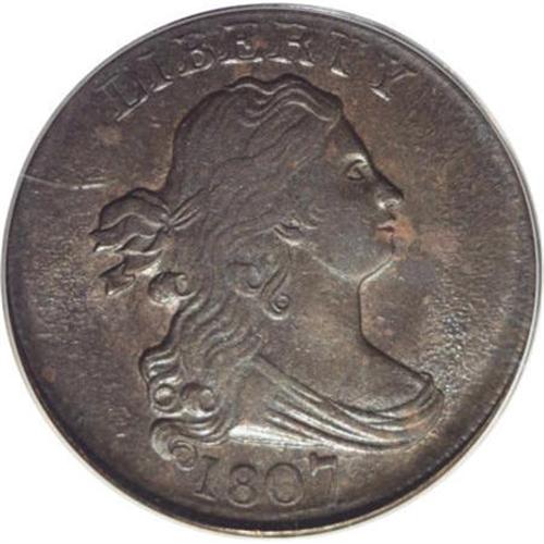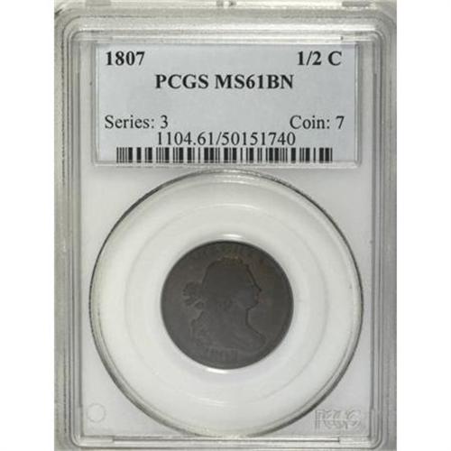 <B>1807 1/2 C MS61 Brown PCGS.</B></I> C-1, B-1, R.1. Manley Die State 3.0. This satiny and nicely struck Draped Bust type coin is surprisingly unabraded aside from a hair-thin mark beneath the date. The right obverse border has an orange-peel texture, as made from a long-in-use obverse die. EAC 55. Population: 3 in 61 Brown, 12 finer (3/08).<BR><BR><B>Coin Engraver:</B> Robert Scot<BR><BR><b>Shipping:</b> Coins & Currency (<a target="_blank" href="http://www.heritageauctions.com/common/shipping.php">view shipping information</a>)