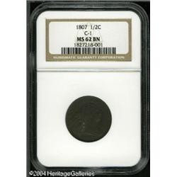 1807 1/2 C MS62 Brown NGC. B-1, C-1, R.1. Pleasing <B>1807 1/2 C MS62 Brown NGC.</B></I> B-1, C-1, R.1. Pleasing chocolate brown color with pale blue accents on the obverse, and well struck design elements, with nice definition on Liberty's hair curls. Minute marks show on Liberty's cheek and neck. Population: 9 in 62, 1 finer (11/04). <BR><BR><B>Important notice:</B> Heritage usually auctions material at the rate of 200-250 lots per hour. On some occasions eBay Live bid software or the Internet may not be able to keep up with the pace of the auction. We recommend placing a realistic absentee bid now as insurance to avoid disappointment. Occasionally the auctioneer may eliminate or reject an eBay Live bid, and the auctioneer may also reopen a lot after the close of the eBay live bidding (usually because we missed an audience bid), and may reject your bid even if it shows you as the winning bidder. By bidding via eBay Live, you agree that Heritage may award the lot to another bidder at its sole discretion under the circumstances described above or any other reasonable circumstances. Since eBay bids are not shown to us until we open the lot on the floor, we treat those bids just like floor bids. In most cases the floor responds before the eBay bid is presented to us, due to Internet lag time, so for consistency we have made it a policy that floor bids are always considered first over tie eBay live bids. Also please note that all Heritage lots purchased through eBay Live carry a 20% Buyer's Premium. Please make sure you read the Terms and Conditions before you bid. This lot is being auctioned in conjunction with a live floor auction by Heritage Galleries & Auctioneers. All final auction and invoice information will be supplied by Heritage Galleries & Auctioneers, and all other information should be considered preliminary. Lot:5018