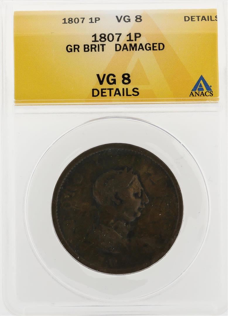 One 1807 1 Penny Great Britain Damaged Coin ANACS VG8 Details. ANACS Appraised.