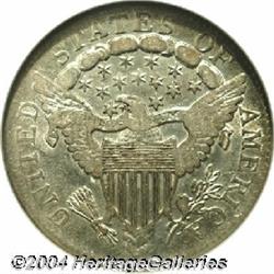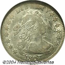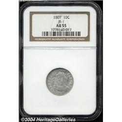 <B>1807<10C> AU55 NGC.</B></I> JR-1, R.1. The dies for 1807 dimes were used extensively, literally until they wore out. In addition to the coinage of 165,000 dimes, the reverse die was used to produce all quarter eagles dated 1805, 1806, and 1807. As such, these coins exist in a wide range of die states, from early states with crisp details on both sides, to late die states that show considerable die wear. This is an example of the later die state. Note the heavy clash marks in the obverse fields, the prominent die bulge through BER of LIBERTY, and the peripheral weakness on both sides. This example is frosty and lustrous, and while appearing to have considerable weakness, is actually a relatively sharply struck coin. The surfaces are essentially untoned with just a hint of champagne color on each side. <BR><BR><B>Important notice:</B> Heritage usually auctions material at the rate of 200-250 lots per hour. On some occasions eBay Live bid software or the Internet may not be able to keep up with the pace of the auction. We recommend placing a realistic absentee bid now as insurance to avoid disappointment. Occasionally the auctioneer may eliminate or reject an eBay Live bid, and the auctioneer may also reopen a lot after the close of the eBay live bidding (usually because we missed an audience bid), and may reject your bid even if it shows you as the winning bidder. By bidding via eBay Live, you agree that Heritage may award the lot to another bidder at its sole discretion under the circumstances described above or any other reasonable circumstances. Since eBay bids are not shown to us until we open the lot on the floor, we treat those bids just like floor bids. In most cases the floor responds before the eBay bid is presented to us, due to Internet lag time, so for consistency we have made it a policy that floor bids are always considered first over tie eBay live bids. Also please note that all Heritage lots purchased through eBay Live carry a 20% Buyer's Premium. Please make sure you read the Terms and Conditions before you bid.