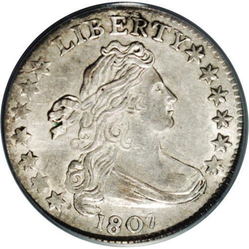 <B>1807<10C> AU58 PCGS.</B></I> JR-1, R.2, the only dies. Blushes of light tan toning enrich this partly lustrous pearl-gray representative. Crisply struck on the major devices, with striking softness noted along the left margins. A trace of friction on the shoulder and forehead denies a Mint State designation. An impressive example of this popular early silver type.