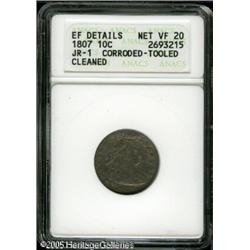 <B>1807 10C --Corroded, Tooled, Cleaned--ANACS. XF Details, Net VF20.</B></I> JR-1, R.2. Streaks of golden-gray patina overlay lightly porous surfaces. An area of corrosion is noted on the eagle's right wing, along with some adjacent scrapes. Some pinscratches are seen in the left reverse field. Lot:6178