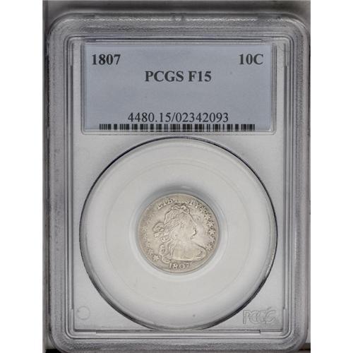 <B>1807<10C> Fine 15 PCGS.</B></I> JR-1, R.2. The obverse shows prominent die clash marks between the bust and date and in the right field. While the devices are clear on both sides, die misalignment makes the strike soft on the left-side obverse stars and LIBERTY, and on the reverse through UNITED.