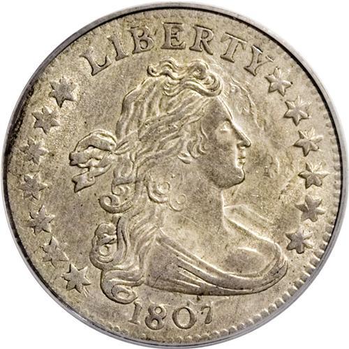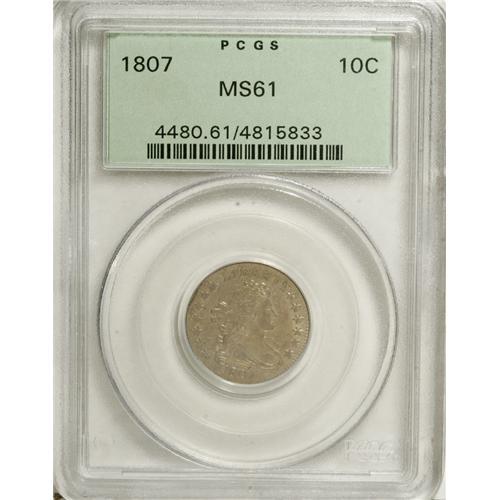 <B>1807 10C MS61 PCGS.</B></I> JR-1, R.2. A comparatively high 165,000 pieces were produced of this final year Draped Bust issue. Incredibly, all were struck from a single pair of dies. This glossy silver-gray representative was likely minted near the middle of the production run, as there is expected weakness on the left obverse stars, moderate to heavy obverse die clashing, and a bit of swelling by stars 12 and 13. The reverse fared better in terms of strike, with the central devices well executed and only minor weakness about the periphery. An affordable Mint State representative of a nearly 200 year-old silver type coin.<BR><I>From The Park Cities Collection.</B></I><BR><BR><b>Shipping:</b> Coin/Currency (<a target="_blank" href="http://www.heritageauctions.com/common/shipping.php">view shipping information</a>)