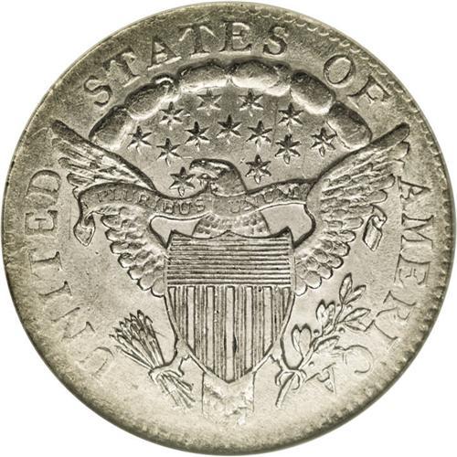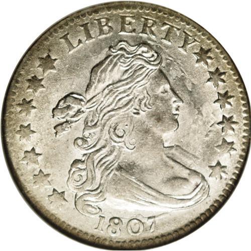 <B>1807<10C> MS62 NGC.</B></I> JR-1, R.2. The only die marriage known for 1807, which was also the final year of the Draped Bust, Heraldic Eagle type. Interestingly, the reverse die was previously used for the production of quarter eagles, in addition to its hardy service in the production of dimes. The major devices are exquisitely struck, although the left side stars are relatively flat. The obverse has heavy clashmarks, as made, with shield lines below the ear, clouds below the bust, and a wreath near Liberty's forehead. Identifiable by a faint mark in the left obverse field near stars 6 and 7.