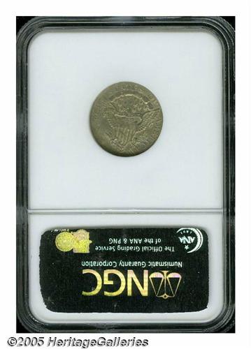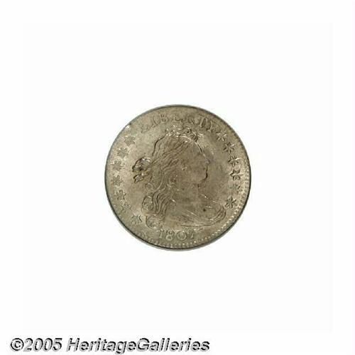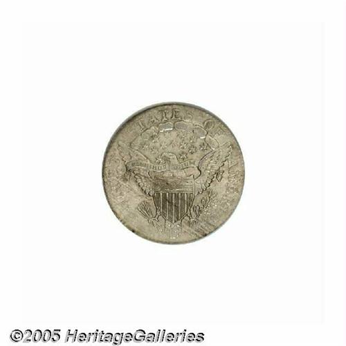 <B>1807<10C> MS62 NGC.</B></I> JR-1, R.2, the only dies. A lustrous light tan-gray Draped Bust Dime that is well struck on the major devices. An outstanding piece from a technical viewpoint, the strike is a bit soft on the left borders and mint-made adjustment marks are noted on the eagle's tail feathers and the reverse border between 5:30 and 8:30. The edge at 10:30 on the obverse and opposite at 7:30 on the reverse is depressed and slightly creased, this is also likely as made. Struck from a strongly clashed obverse die.