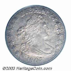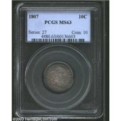 <TABLE cellSpacing=0 cellPadding=0 width="100%" bgColor=#000000 border=0><TBODY><TR><TD width="100%"><TABLE cellSpacing=1 cellPadding=3 width="100%" border=0><TBODY><TR><TD width="100%" bgColor=#79735c><FONT face=arial color=#ffffff size=3><B>Description</B> </FONT></TD></TR><TR><TD width="100%" bgColor=#ffffff><FONT face=arial size=2><B>1807 10C MS63 PCGS.</B></I> JR-1, R.2. The only die marriage known for 1807, which was also the final year of the Draped Bust, Heraldic Eagle type. Interestingly, the reverse die was previously used for the production of Quarter Eagles, in addition to its hardy service in the production of Dimes. The major devices are exquisitely struck, although the left side stars are relatively flat. The obverse has heavy clashmarks, as made, with shield lines below the ear, clouds below the bust, and a wreath near Liberty's forehead. A very short pinscratch rests in the field near Liberty's nose, but the surfaces are refreshingly unmarked. </FONT></TD></TR></TBODY></TABLE></TD></TR></TBODY></TABLE><BR><A name=PricesRealized></A><TABLE cellSpacing=0 cellPadding=0 width="100%" bgColor=#000000 border=0><TBODY><TR><TD width="100%"><TABLE cellSpacing=1 cellPadding=3 width="100%" border=0><TBODY><TR><TD width="100%" bgColor=#79735c><A name=PR><FONT face=arial color=#ffffff size=3><B>Previous Prices from Heritage Auctions</B> </FONT></A></TD></TR><TR><TD bgColor=#f6f6ed><TABLE cellSpacing=0 cellPadding=0 width="100%" border=1><TBODY><TR><TD align=middle width="33%"><B>Date</B></TD><TD align=middle width="33%"><B>Service</B></TD><TD align=middle width="33%"><B>Price</B></TD></TR><TR bgColor=whitesmoke><TD width="33%"><B>03/21/2002</B></TD><TD width="33%">PCGS</TD><TD width="33%">$8,625.00</TD></TR><TR bgColor=whitesmoke><TD width="33%"><B>03/22/1997</B></TD><TD width="33%">PCGS</TD><TD width="33%">$3,910.00</TD></TR><TR bgColor=whitesmoke><TD width="33%"><B>03/14/1996</B></TD><TD width="33%">PCGS</TD><TD width="33%">$4,950.00</TD></TR><TR bgColor=whitesmoke><TD width="33%"><B>01/01/1996</B></TD><TD width="33%">PCGS</TD><TD width="33%">$4,840.00</TD></TR><TR bgColor=whitesmoke><TD width="33%"><B>01/01/1999</B></TD><TD width="33%">PCGS</TD><TD width="33%">$5,060.00</TD></TR></TBODY></TABLE></TD></TR><TR><TD bgColor=#ffffff><FONT face=arial size=1 ?>PLEASE NOTE: All prices realized reflect the final hammer price PLUS the buyer's premium in auctions that charge a buyer's premium. Each item has a notation at the top of the listing indicating whether that lot included a buyer's premium. Example: A item that sells with a final hammer price of $100 and a 20% buyer's premium will display with a price realized of $120. All information listed is intended to be as accurate as possible, but errors are possible. Please use this guide carefully and inform us of any inaccuracies. </FONT></TD></TR></TBODY></TABLE></TD></TR></TBODY></TABLE><BR><TABLE cellSpacing=0 cellPadding=0 width="100%" bgColor=#000000 border=0><TBODY><TR><TD width="100%"><TABLE cellSpacing=1 cellPadding=3 width="100%" border=0><TBODY><TR><TD width="100%" bgColor=#79735c colSpan=6><FONT face=arial color=#ffffff size=3><B>Price Guide*</B> </FONT></TD></TR><TR bgColor=#f6f6ed><TD align=middle><B>Grade</B> </TD><TD align=middle><B>Coin World<BR>(Trends)</B> </TD><TD align=middle><B>Numismedia<BR>Retail</B> </TD><TD align=middle><B>Numismedia<BR>Wholesale</B> </TD><TD align=middle><B>Coin<BR>Universe</B> </TD><TD align=middle><B>Heritage<BR>Value Index</B> </TD></TR><TR bgColor=#ffffff><TD align=middle>62</TD><TD align=right>$7,500.00</TD><TD align=right>---</TD><TD align=right>$4,450.00</TD><TD align=right>$5,500.00</TD><TD align=right>$4,776.25</TD></TR><TR style="FONT-WEIGHT: bold" bgColor=#cccfdd><TD align=middle>63</TD><TD align=right>$10,000.00</TD><TD align=right>---</TD><TD align=right>$7,225.00</TD><TD align=right>$9,000.00</TD><TD align=right>$6,486.25</TD></TR><TR bgColor=#ffffff><TD align=middle>64</TD><TD align=right>---</TD><TD align=right>---</TD><TD align=right>$9,850.00</TD><TD align=right>$18,500.00</TD><TD align=right>$10,836.67</TD></TR><TR bgColor=#ffffff><TD colSpan=6><FONT size=1>*All information listed is intended to be as accurate as possible, but errors are possible. No item may be returned or refused based on this information which is provided as a service to our customers. You should contact each pricing source directly to determine the accuracy of this information. </FONT></TD></TR></TBODY></TABLE></TD></TR></TBODY></TABLE><BR><TABLE cellSpacing=0 cellPadding=0 width="100%" bgColor=#000000 border=0><TBODY><TR><TD width="100%"><TABLE cellSpacing=1 cellPadding=3 width="100%" border=0><TBODY><TR><TD width="100%" bgColor=#79735c><FONT face=arial color=#ffffff size=3><B>Population Guide</B> </FONT></TD></TR><TR bgColor=#ffffff><TD align=middle><!-- Begin Output of Population Grid--><TABLE cellSpacing=0 cellPadding=0 width="100%" border=0><TBODY><TR><TD vAlign=center><TABLE cellSpacing=0 width="100%" border=1 cellsadding="3"><TBODY><TR><TD vAlign=center><TABLE cellSpacing=0 cellPadding=3 width="100%" border=1><TBODY><TR><TD vAlign=center align=middle bgColor=#f0f1e8 colSpan=2 <CENTER><FONT face=Arial size=2><B>PCGS Pop </B></FONT><CENTER></CENTER></TD><TD vAlign=center align=middle bgColor=#f0f1e8 colSpan=2><CENTER><FONT face=Arial size=2><B>NGC Pop</B></CENTER></FONT></TD></TR><TR><TD vAlign=center><FONT face=Arial size=2>(63)</FONT> </TD><TD vAlign=center align=right><FONT face=Arial size=2>49</FONT> </TD><TD vAlign=center><FONT face=Arial size=2>(63)</FONT> </TD><TD vAlign=center align=right><FONT face=Arial size=2>22</FONT> </TD></TR><TR><TD vAlign=center><FONT face=Arial size=2>(>63)</FONT> </TD><TD vAlign=center align=right><FONT face=Arial size=2>30</FONT> </TD><TD vAlign=center><FONT face=Arial size=2>(>63)</FONT> </TD><TD vAlign=center align=right><FONT face=Arial size=2>29</FONT> </TD></TR></TBODY></TABLE></TD></TR></TBODY></TABLE></TD></TR></TBODY></TABLE><!-- End Output of Population Grid-->