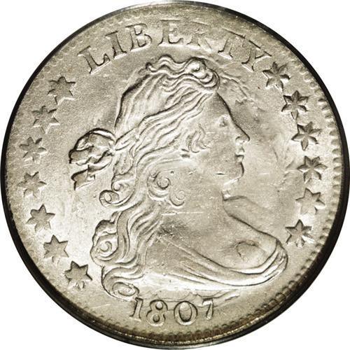 <B>1807<10C> MS64 PCGS.</B></I> JR-1, R.2. The only dies for this final Draped Bust date. This untoned and lustrous near-Gem is generally well struck. Selected peripheral elements, such as the ER in LIBERTY, lack full detail due to the late die state. The obverse displays prominent clash marks, but the reverse field does not. The mintage of 165,000 appears plentiful, however, less than 1% of this production has survived, regardless of grade. Mint State populations are likely inflated by resubmissions, nonetheless, the 1807, along with the 1805 4 Berries, is often targeted by those building high quality early silver type sets. The present beautiful piece would be a standout within such a collection.