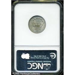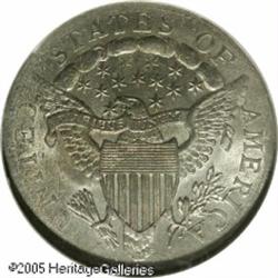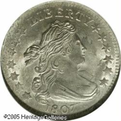 <B>1807 10C MS65 NGC.</B></I> JR-1, R.2. The reverse die was used for the production of these dimes, as well as early quarter eagles dated 1805 through 1807. For the collector with a passion toward minting processes and coinage procedures, this is an excellent study example. Extensive clash marks are visible in the fields, and they are especially prominent on the obverse right and left of the central device. Breen noted that the dies clashed as many as nine times. Since the clash marks are only visible on the obverse die, it is a reasonable assumption that the reverse die may have been removed from the press and polished or lapped to remove the damage. Little of the design details show evidence of this lapping, so it may also be the case that the die steel of the reverse die was slightly harder, resulting in more resistance to the die clashing defects. As a late die state example, much of the border and peripheral detail is weakened. This example is fully lustrous with frosty silver surfaces and excellent eye appeal. The surfaces are essentially brilliant with slight tendencies toward ivory color. It is a splendid example with excellent surfaces. Population: 14 in 65, 2 finer (1/05). Lot:6182