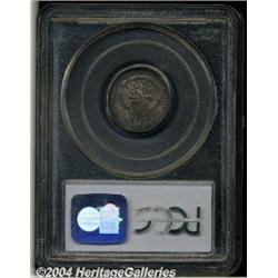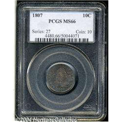 <B>1807<10C> MS66 PCGS.</B></I> JR-1, the only known dies, R.2. The reverse die for the 1807 dime had previously been used to strike four quarter eagle issues: the 1805, 1806/4, 1806/5, and 1807. Once it was converted to use for dimes dated 1807, well over 100,000 pieces were produced. As a result, most of the examples known today display multiple die problems, including weak definition on the left side of the obverse, die clashing in the right obverse field, repolishing, and missing peripheral details on late strikings. This particular coin shows softness on the left obverse stars, and close examination with a magnifier reveals die clashing on the right side of the obverse--minimal Mint-made problems for this issue. Post-striking impairments are virtually non-existent. The mint luster is thick and frosted, being strongly in evidence beneath the deep violet and blue toning that covers each side. An exquisite type coin and virtually unexcelled in technical grade (NGC has certified one piece finer). Population: 2 in 66, with none finer (3/04). <BR><BR><B>Important notice:</B> Heritage usually auctions material at the rate of 200-250 lots per hour. On some occasions eBay Live bid software or the Internet may not be able to keep up with the pace of the auction. We recommend placing a realistic absentee bid now as insurance to avoid disappointment. Occasionally the auctioneer may eliminate or reject an eBay Live bid, and the auctioneer may also reopen a lot after the close of the eBay live bidding (usually because we missed an audience bid), and may reject your bid even if it shows you as the winning bidder. By bidding via eBay Live, you agree that Heritage may award the lot to another bidder at its sole discretion under the circumstances described above or any other reasonable circumstances. Since eBay bids are not shown to us until we open the lot on the floor, we treat those bids just like floor bids. In most cases the floor responds before the eBay bid is presented to us, due to Internet lag time, so for consistency we have made it a policy that floor bids are always considered first over tie eBay live bids. Also please note that all Heritage lots purchased through eBay Live carry a 20% Buyer's Premium. Please make sure you read the Terms and Conditions before you bid.