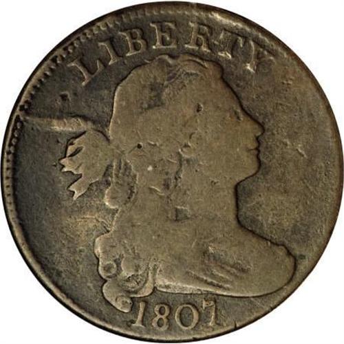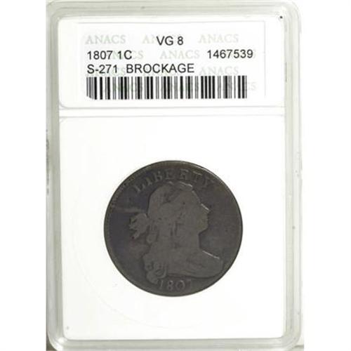 <B>1807 1C Comet--Brockage--VG8 ANACS.</B></I> S-271, B-1, R.1. The reverse is an incused and reversed impression of the obverse. This mint error occurs when a newly struck coin clings to the reverse die instead of getting ejected. A planchet is fed in between the obverse die and the previously struck coin, and the subsequent strike causes a brockage reverse. An unmarked medium brown example with a prominent "comet" die break above the hair ribbon. An S-271 appeared as lot 1059 in Richard Picker's collection of brockages (Coin Galleries, 5/89). EAC 6.<BR><BR><B>Coin Engraver:</B> Robert Scot<BR><BR><b>Shipping:</b> Coins & Currency (<a target="_blank" href="http://www.heritageauctions.com/common/shipping.php">view shipping information</a>)