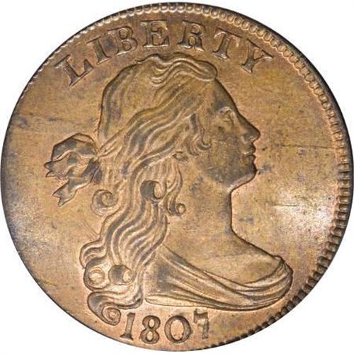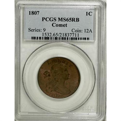 <B>1807 1C Comet MS65 Red and Brown PCGS.</B></I> S-271, B-1, R.1. This 1807 "Comet" cent transcends not only the variety, but also the date and the viewer then becomes transfixed on the amazing state of preservation and eye appeal of this majestic copper. Beyond being in the upper Condition Census for the variety, this S-271 finds itself in a small fraternity of Draped Bust cents that have survived in Gem or better condition and an even smaller group of said coins that have retained some level of original mint red coloration. To illustrate this point, the PCGS <I>Population Report</B></I> lists a grand total of 63 Draped Bust cents grading MS65 or better out of all dates (1796-1807) and all varieties (11/07). Of those 63 coins, a mere 28 have been granted the Red and Brown designation, and only one example in the entire series has thus far been deemed worthy of being labeled as Red at the Gem or better level. <BR> But aficionados of early copper are less concerned with the population data of third party certification companies than with the Condition Census information compiled by Bland and Noyes. The current coin was omitted in both of the aforementioned census compilations simply because it had been lost to collectors after its last appearance in a public auction conducted in 1940. Noyes concluded that the Helfenstein and Naftzger-Streiner-Parrino examples are equal in condition and thus share the top two spots. We have determined that the latter coin is, through careful examination of pedigree markers, the other PCGS MS65 Red and Brown coin and the one sold in Heritage's November 2001 Santa Clara sale. It is also the Noyes plate coin, where he considered it to grade MS65 in his Condition Census. The third coin in Noyes' Census, the Downing-Naftzger-Rasmussen piece, last appeared in Heritage's January 2005 sale of the Wes Rasmussen collection, where it realized $37,375. At the time of that sale, it resided in an NGC MS64 Brown holder and likely still does. The current example would be included in the top three of the Condition Census and likely reside in the upper part of that small, elite group. <BR> The extraordinary aesthetic qualities of this 1807 Comet cent are further enhanced by its storied past. This coin was one of two Uncirculated Draped Bust cents that were found in an old trunk sometime before 1916. It was first offered for public sale by Henry Chapman in his 1916 sale of the Clarence Bement collection and has publicly traded hands a mere four times since. After its last public appearance in May 1940, this piece disappeared from the numismatic radar until resurfacing in a March 2005 sale by American Numismatic Rarities. <BR> Breathtaking original mint red coloration intermingled with light brown toning is announced by richly lustrous surfaces that have avoided any mentionable distractions, thanks in whole to the careful custodianship of the previous owners. A few areas of darker toning are observed on some of the highpoints, yet are commensurate with the assigned grade. The old cardboard box once used to store this Gem shall be passed on the successful bidder of this lot. The box is annotated: "1807 Comet. UNC. gem. best known." Population: 2 in 65 Red and Brown, 0 finer (11/07). EAC 60+.<BR><I>Ex: Clarence Bement Collection (Henry Chapman, 5/1916), lot 320; Dr. Henry Beckwith Collection (S.H. Chapman, 4/1923), lot 38; S.H. Chapman to A.C. Gies; Barney Bluestone's 51st Sale (5/1940); Hogan Pond Collection (American Numismatic Rarities, 3/2005).<BR>From The Madison Collection.</B></I><BR><BR><B>Coin Engraver:</B> Robert Scot<BR><BR><b>Shipping:</b> Coins & Currency (<a target="_blank" href="http://www.heritageauctions.com/common/shipping.php">view shipping information</a>)